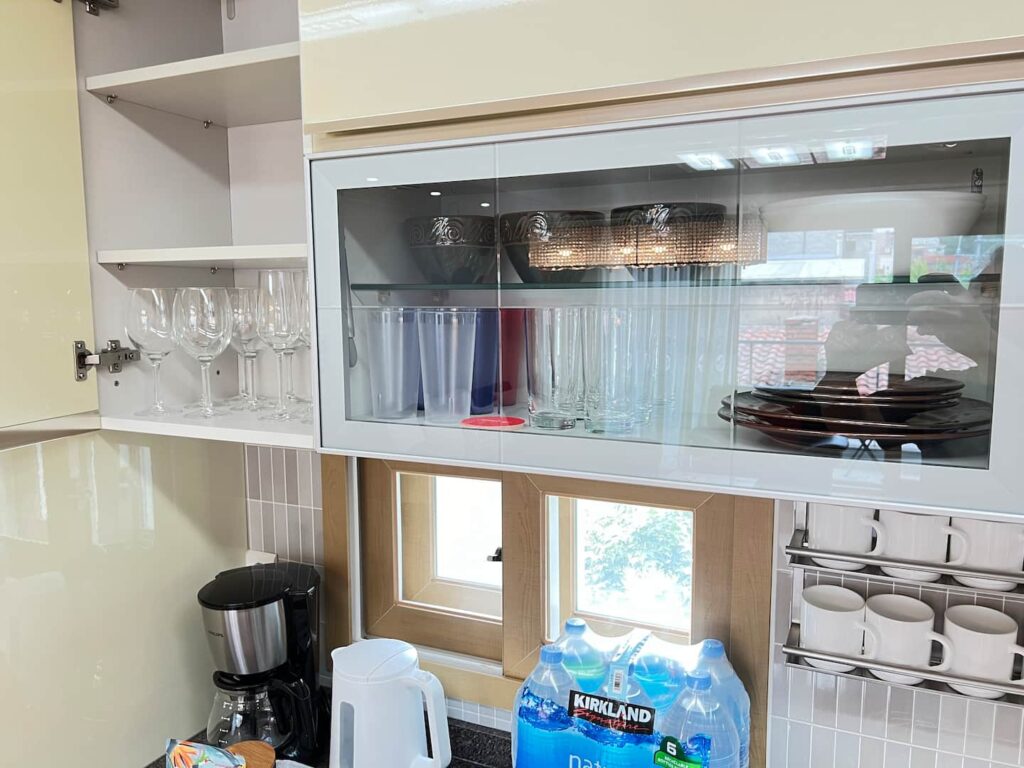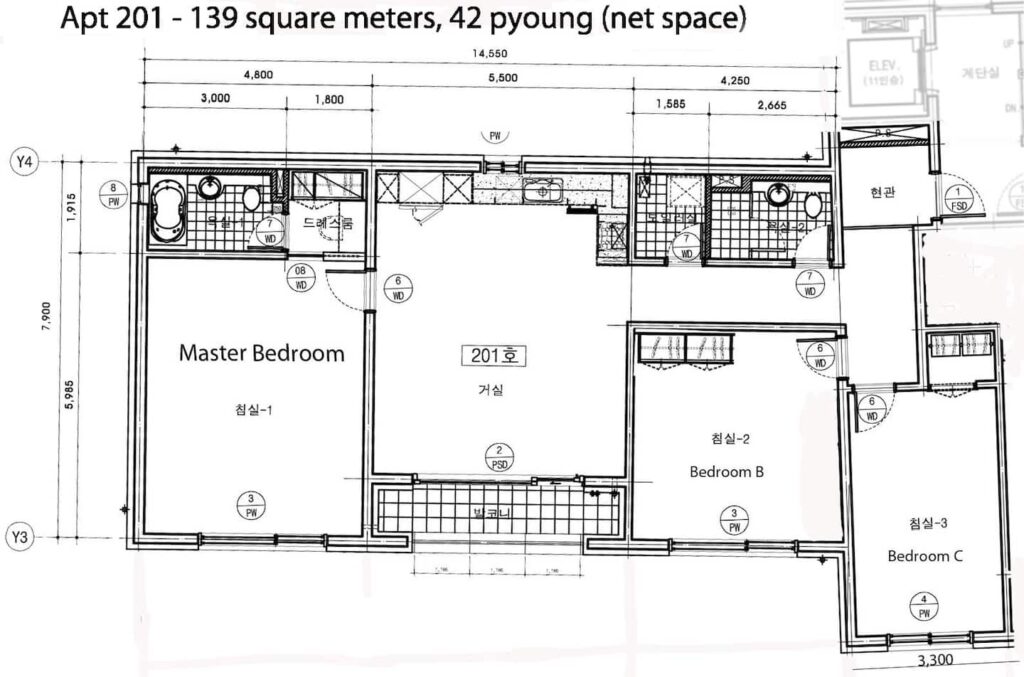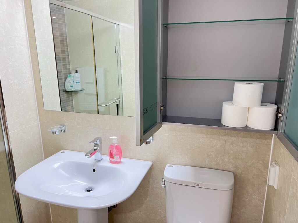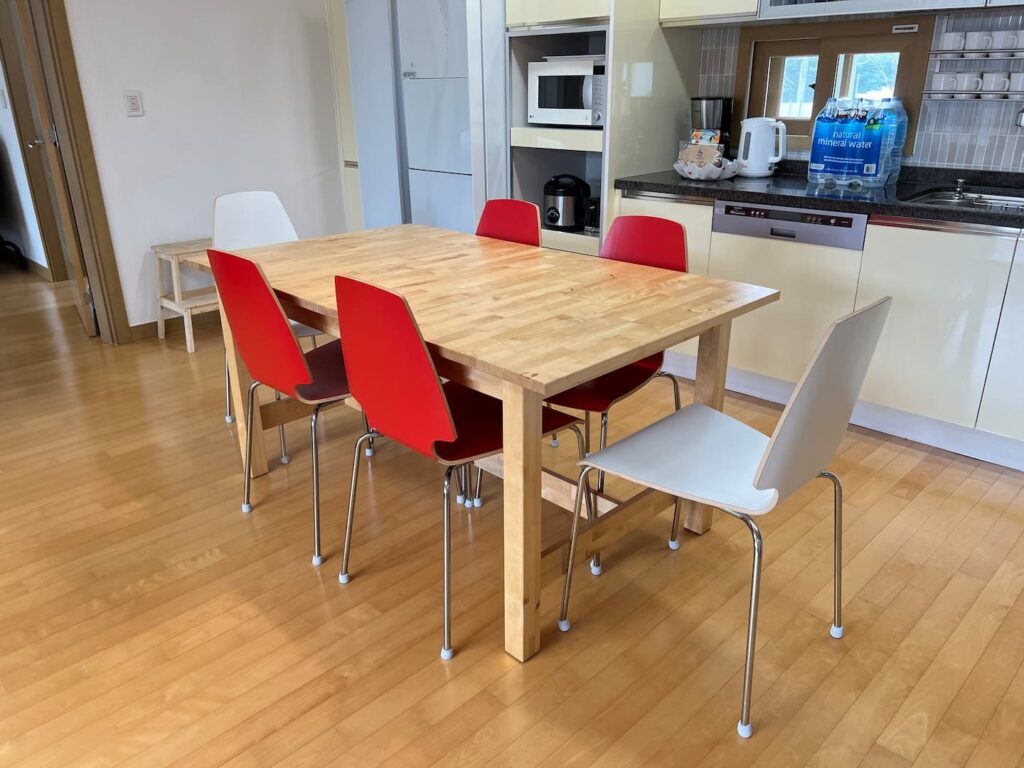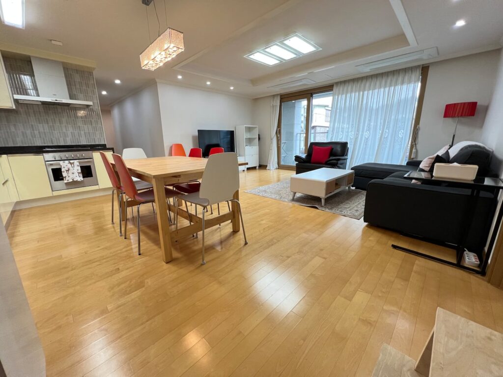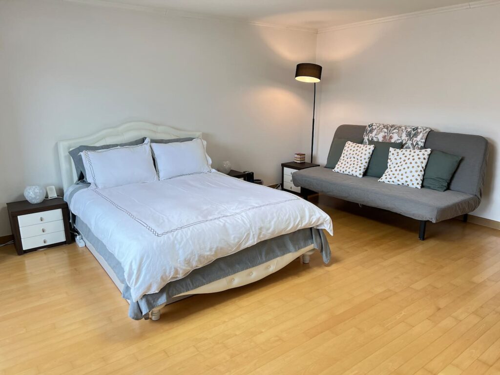 Apartment 201 is a modern 139m² (1500 ft²) 3-bedroom 2-bath unit with a 5m² (54 ft²) balcony… Enormous master bedroom, well-lit makeup room, huge well-equipped kitchen. The living area has full-height windows into the east-facing balcony, a couch with a love seat, a big comfy chair with lots of lighting and a 55” QLED smart TV. The adjacent dining area has seating for six to eight.
