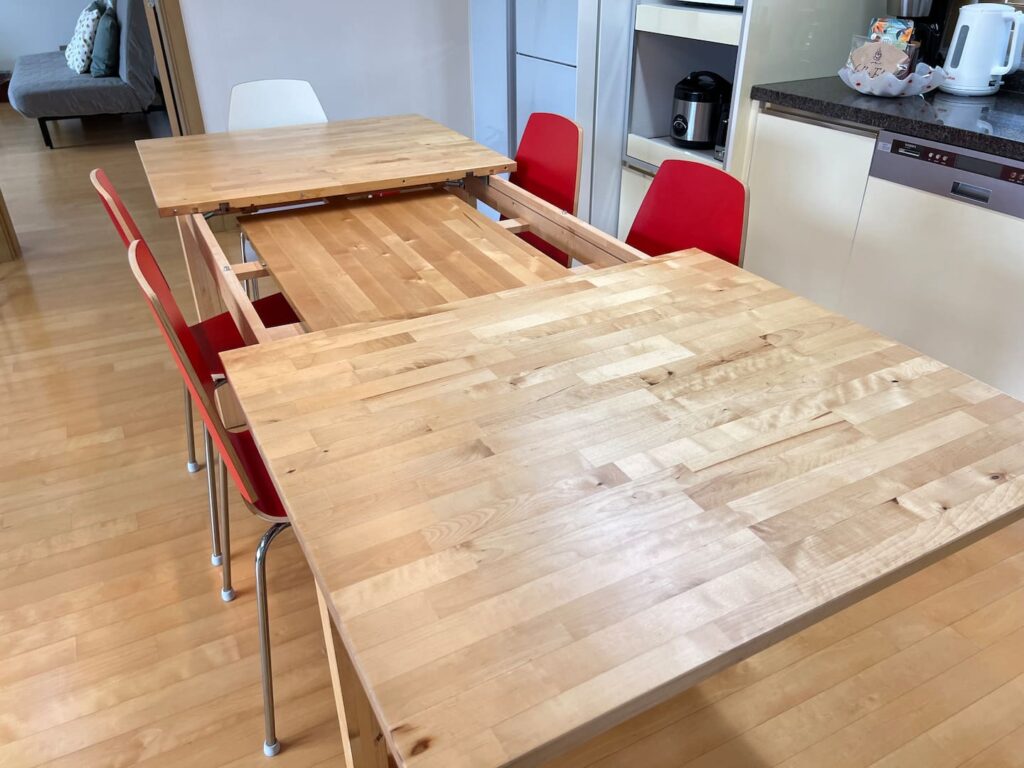 This apartment’s dining room features comfortable lighting and an expandable table to accommodate extra guests.