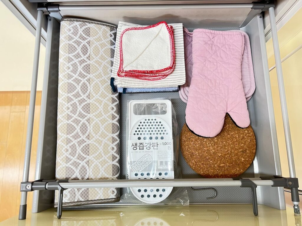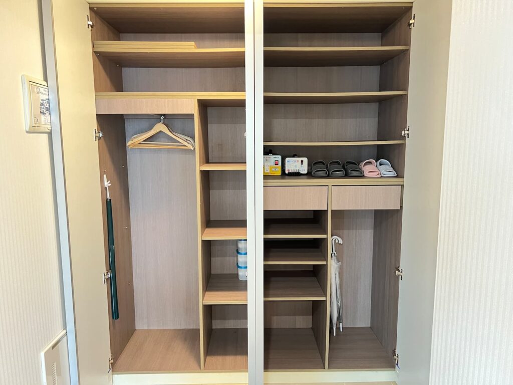 The entrance hallway has a shoe and utility closet as well as a coat rack.