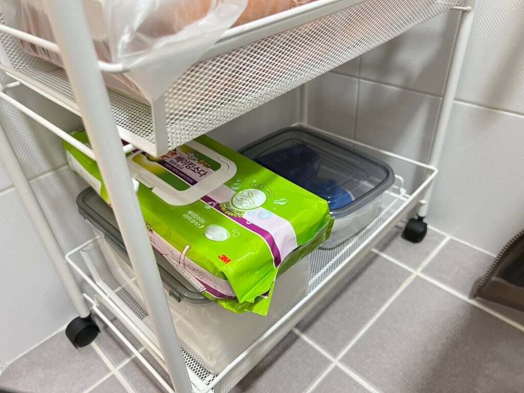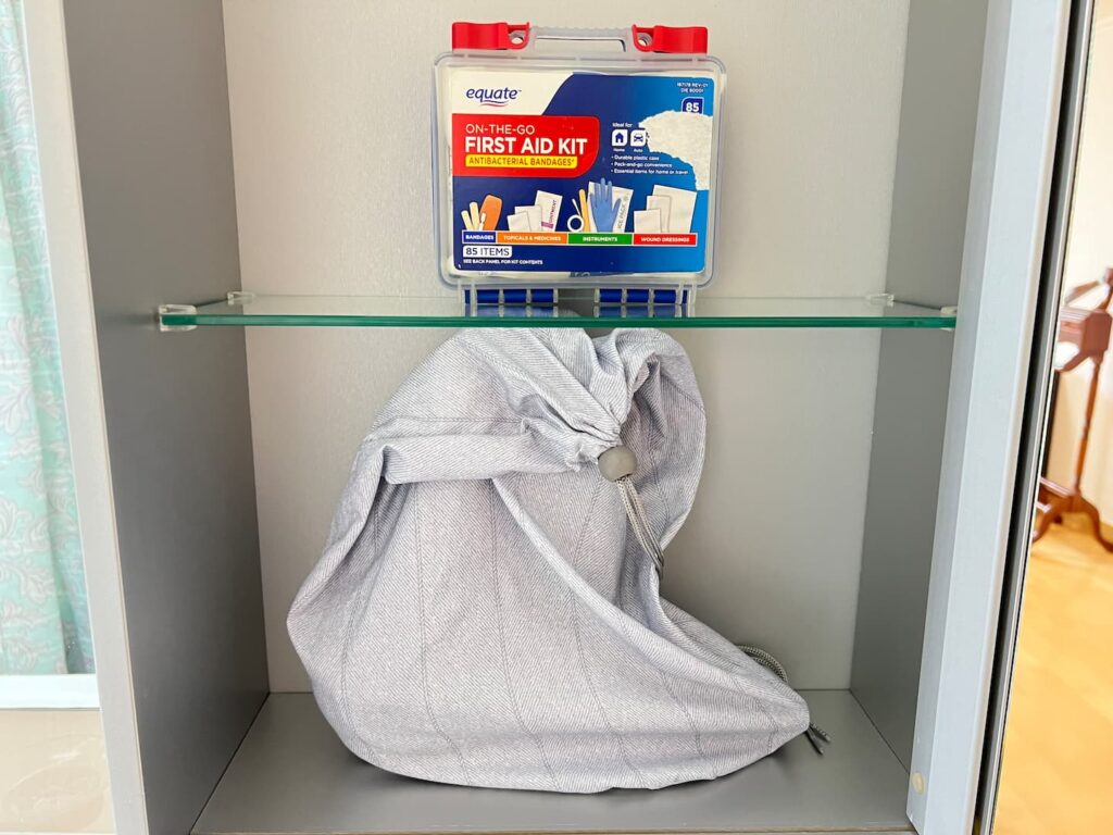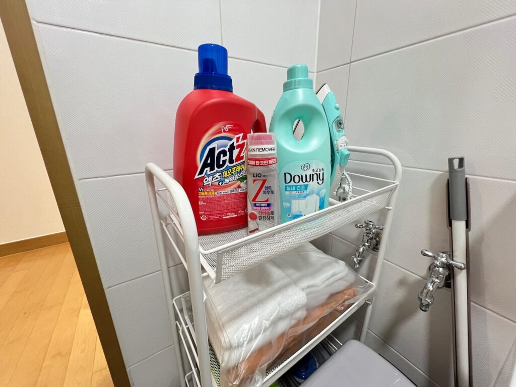 The laundry room has a new, easy to use washer and dryer stack and all the supplies you need for laundry and cleaning.