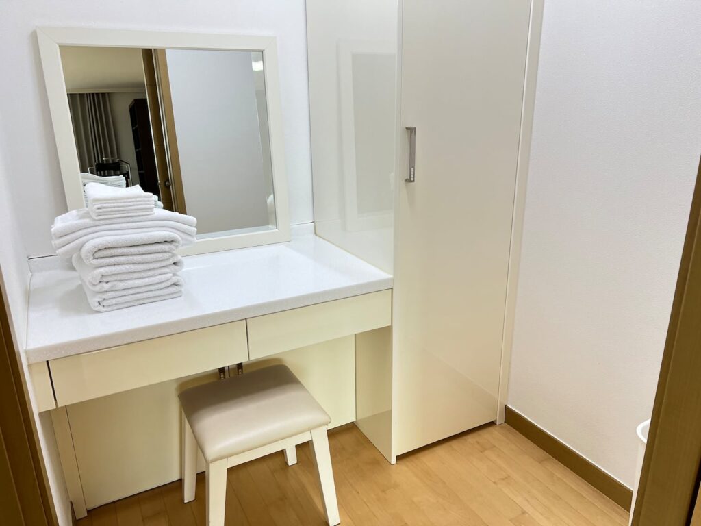 The master bedroom is HUGE and has a makeup room between the bathroom and the bedroom separated by a pocket door. There’s a sofa-bed, large desk, ample closet and dresser space