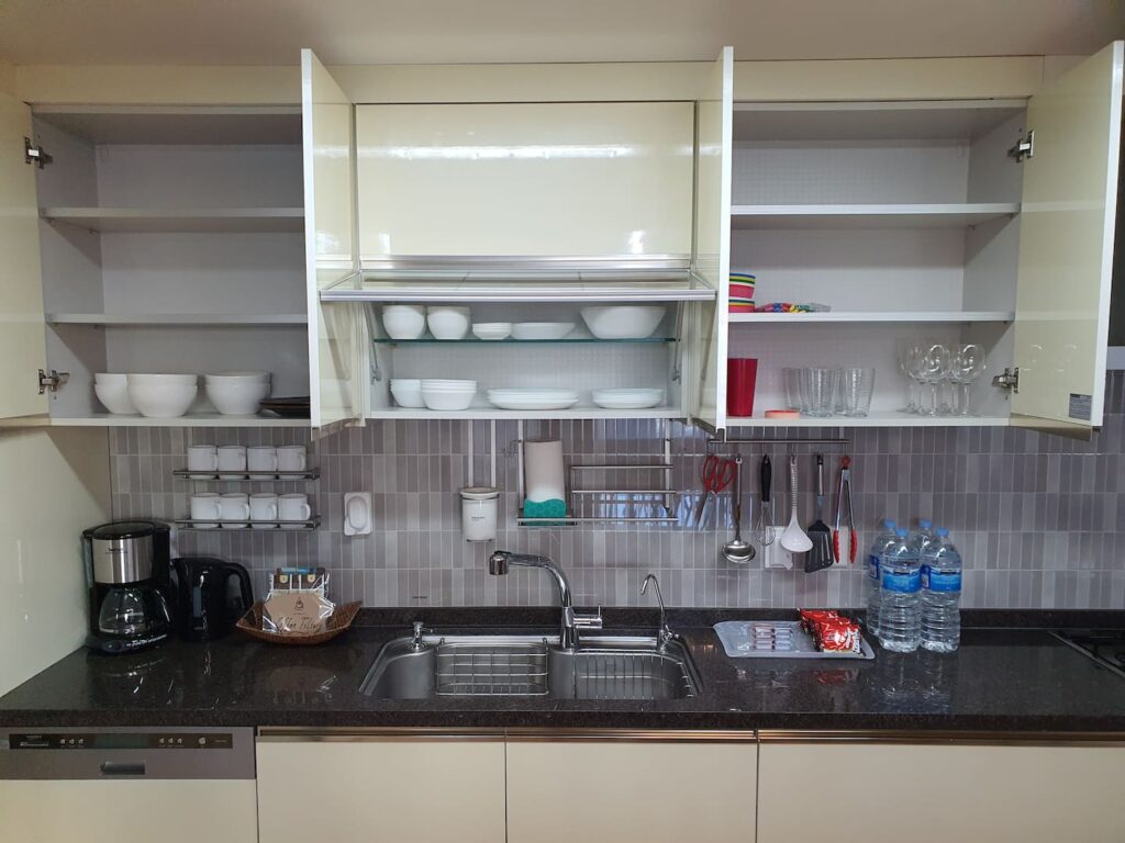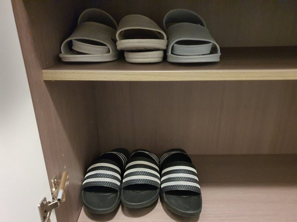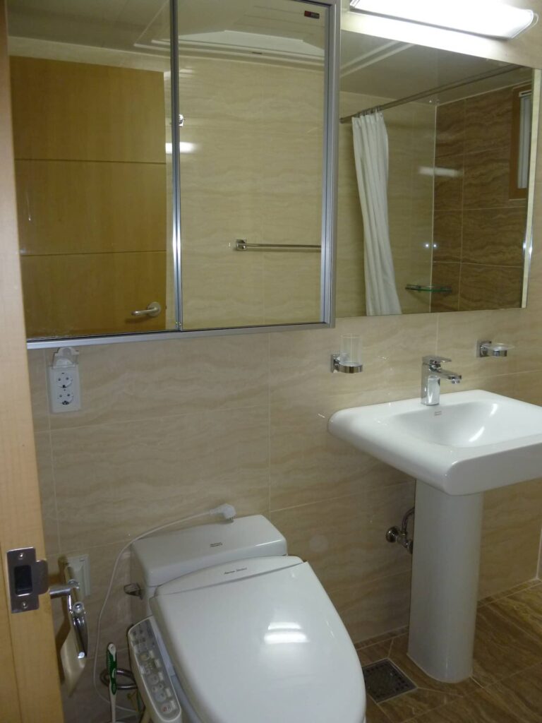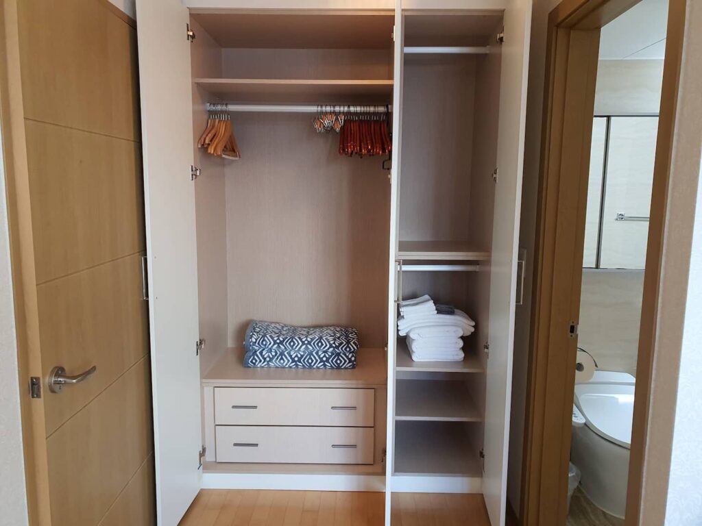 The second bedroom features two single beds, a desk and office chair, a dresser and a wardrobe (closet). The third bedroom sports a queen size bed, tons of closet and drawer space, a large desk and office chair, and a full-length mirror. Outside the second and third bedrooms is a second bathroom with an electronic bidet, lots of mirrors and a glass stall shower with rainfall and hand-held shower heads.