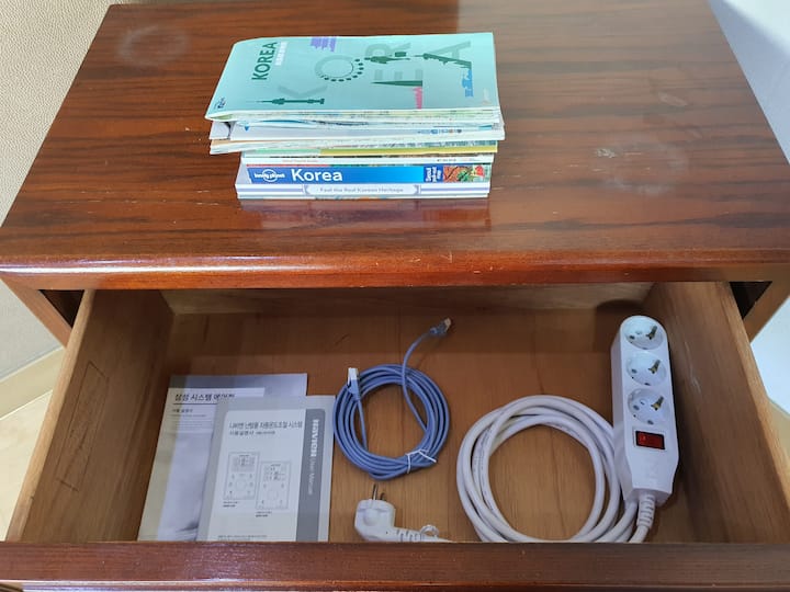 Lots of comfortable seating, coffee table, TV, huge windows to the balcony, lots of flexible lighting. Spare power strip, Ethernet cable, manuals and tourism info in the cabinet.