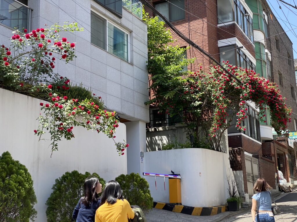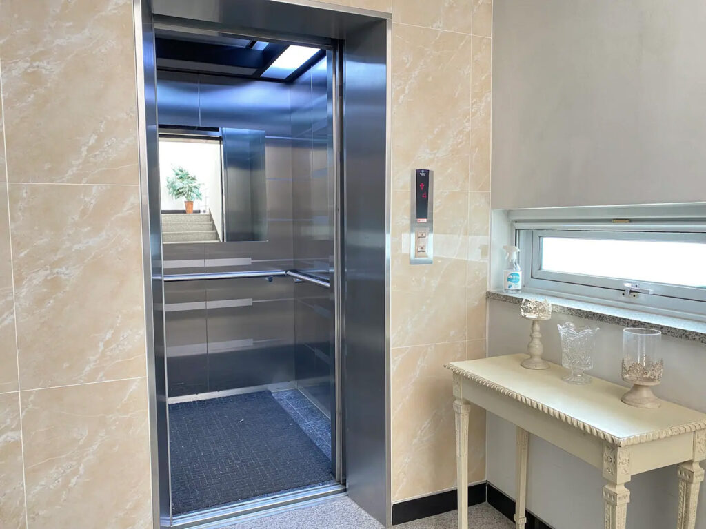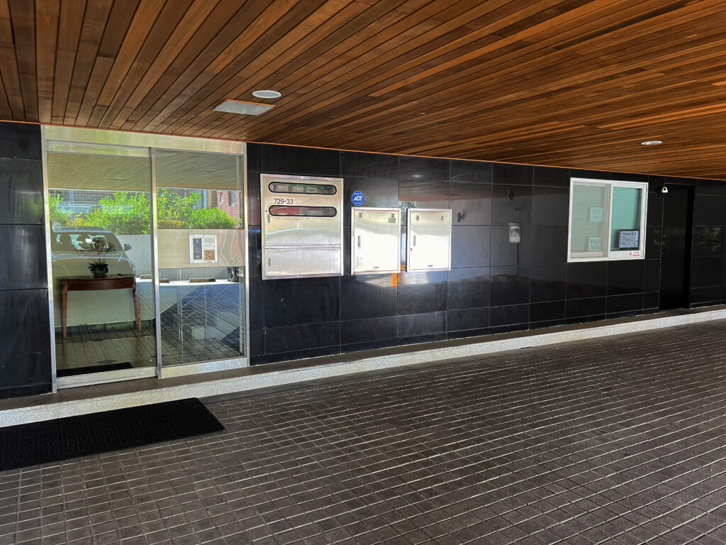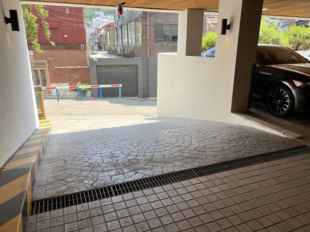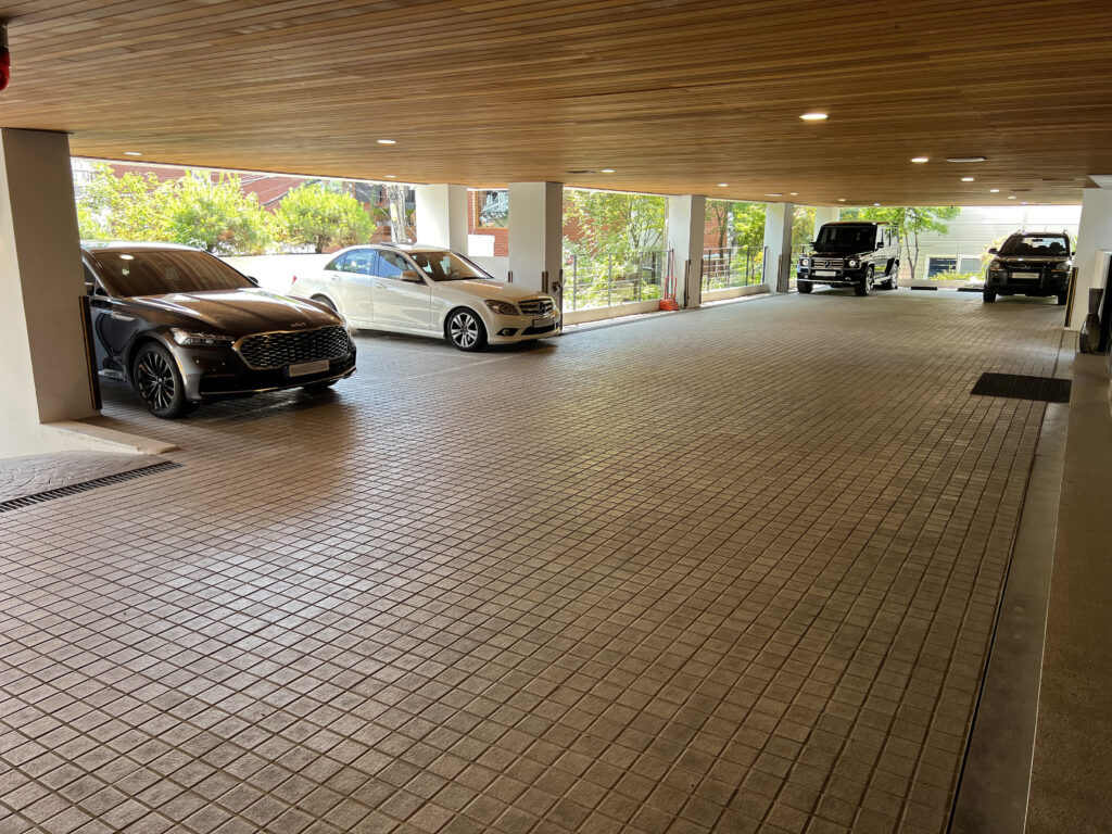Covered well-lit parking deck with room for up to eight full-size vehicles plus one subcompact. Ceiling clearance of 2.1m allows room for most vans and pickup trucks. Short ramp from street level is on the left and lobby entrance is on the right.